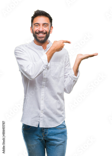 Adult hispanic man over isolated background amazed and smiling to the camera while presenting with hand and pointing with finger.