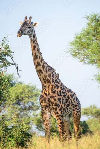 Adult male Masai giraffe (Giraffa tippelskirchi) with bald ossicones indicating his maleness gender male sex, Tarangire, Tanzania