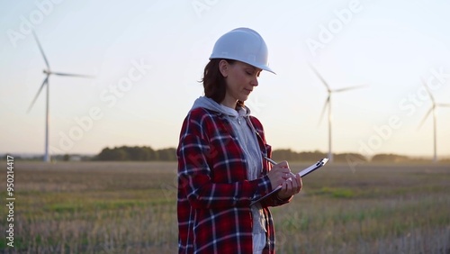 Adult woman engineer taking notes on a clipboard on a field with wind turbines, as the sun sets