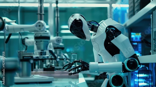 Advanced AI robotics performing complex operations with precision in a high-tech lab.