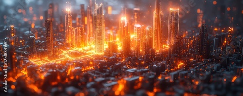 Advanced AI-powered city with interactive holograms displaying energy consumption, transportation efficiency, and smart living features