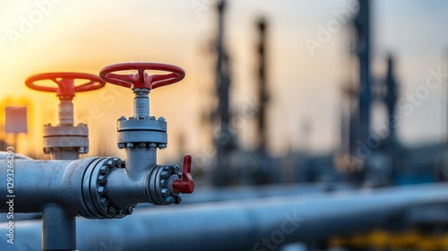 Advanced Biofuel Refinery and High-Tech Fuel Innovation, Industrial valves with red handles against a sunset backdrop in a refinery setting.