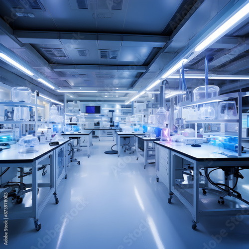 Advanced Biomedical Engineering Laboratory with Futuristic Lighting and Panoramic View