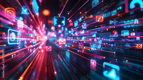 Advanced computing network with a dynamic flow of cyber icons and data points.