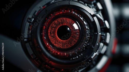 Advanced cybernetic eye with red glowing circuits and detailed vision. AI generative.