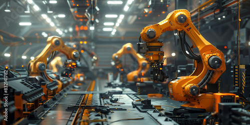 Advanced factory automation with multiple robotic arms, modern industrial environment, high-tech production line
