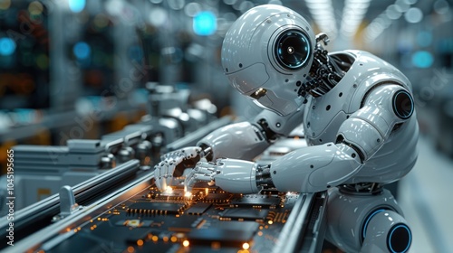 Advanced high-precision robotic arm in Bright Electronics hospital, cutting-edge surgical innovation, component installation on circuit board, state-of-the-art fully automatic PCB assembly line