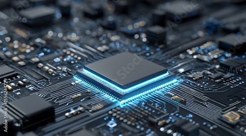 Advanced high-tech microchip glowing with intense blue light, embedded in a futuristic electronic circuit board background