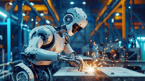 Advanced humanoid robot performing welding tasks in an industrial setting, surrounded by sparks and machinery.