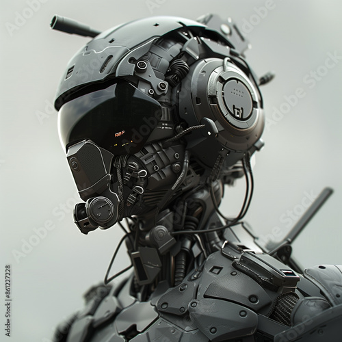 Advanced humanoid robot with black armor, intricate mechanical details, futuristic design, cybernetic headgear, standing against a gray background, highly detailed and modern