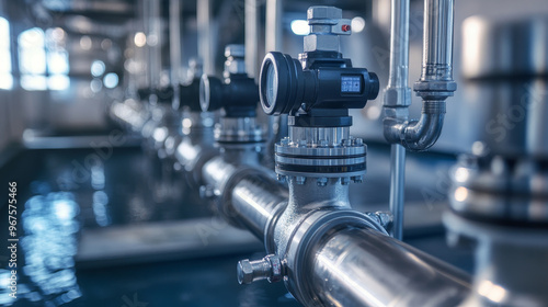 Advanced industrial water pump station featuring high tech valves and pipes, showcasing modern engineering and efficiency in water management