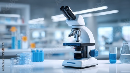 Advanced Laboratory Microscope Positioned on a Clean Workbench With Glassware and Blue Liquid Samples During a Bright Daytime Setup