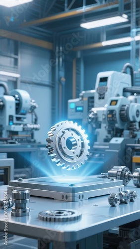 Advanced Manufacturing Facility with Automated Machinery and Holographic Gear Display