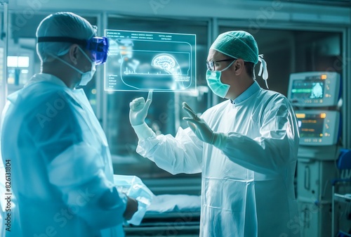 Advanced Medical Technology in Action, Transparent Digital Screen Displaying Brain Scan in a Surgery Room
