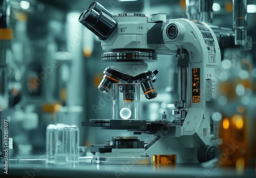 Advanced Microscope in Laboratory Setting Examining Biological Samples Under Bright Illumination for Scientific Research and Discovery