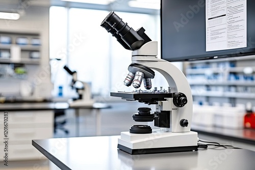 advanced microscope setup with a thesis hanging on the wall, emphasizing postgraduate research environment