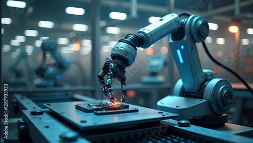 Advanced robotic arm assembling components on a production line in a modern factory setting