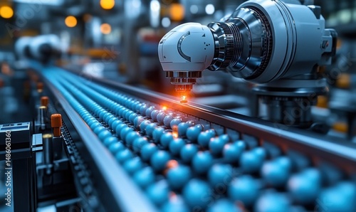 Advanced robotic arm inspecting or processing multiple small blue spherical objects on a conveyor belt in a high-tech automated industrial setting