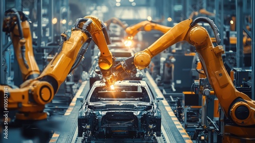 Advanced robotic arms assembling vehicles in a high-tech manufacturing facility, showcasing modern automation in the automotive industry.
