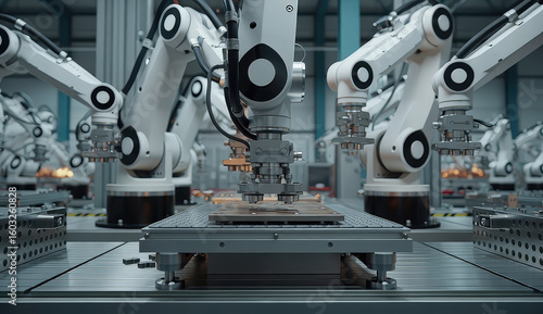 Advanced robotic arms operate in a modern manufacturing facility during daylight hours showcasing precision assembly tasks