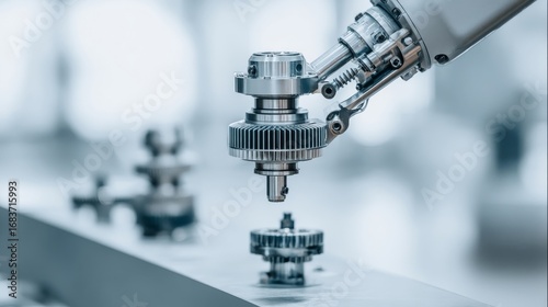 Advanced robotic equipment in an industrial manufacturing setup with articulated arms and precision tools,