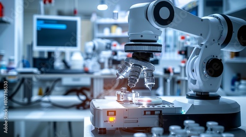 Advanced robotic microscope in a modern laboratory setting, symbolizing scientific research and technological innovation. Concept of science, technology, and innovation.
