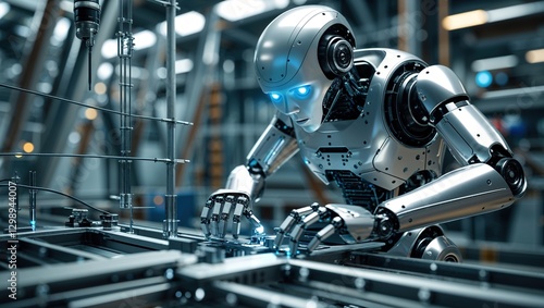 Advanced robotic technology performs intricate tasks in a factory, showcasing automation's impact on the workforce and productivity. The scene emphasizes the precision of machines