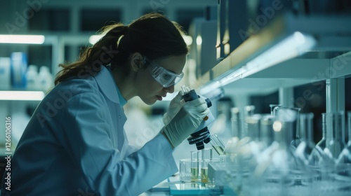 Advanced scientific lab, two researchers analyzing chemicals in a flask, discussing findings, medical research, biotechnology, molecular biology