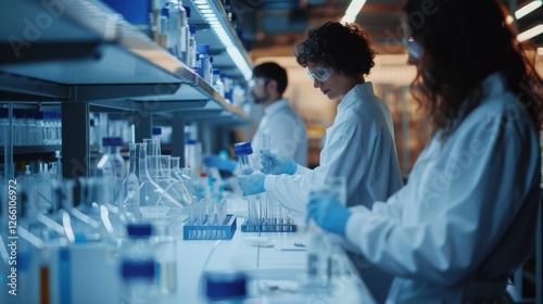 Advanced scientific lab, two researchers analyzing chemicals in a flask, discussing findings, medical research, biotechnology, molecular biology