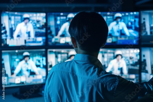 Advanced security control room with CCTV cameras monitoring various points Security guard oversees