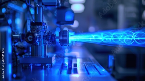 Advanced Technology: Blue Light Beam Emitting from High-Tech Machinery in a Modern Laboratory or Factory Setting