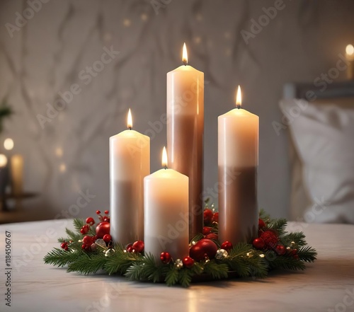 Advent candle arrangement with shiny lights on a side table, advent candles, shiny lights