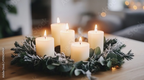 Advent wreath adorned with five lit candles amidst festive greenery, symbolizing the final Sunday of the Advent season in a cozy setting.