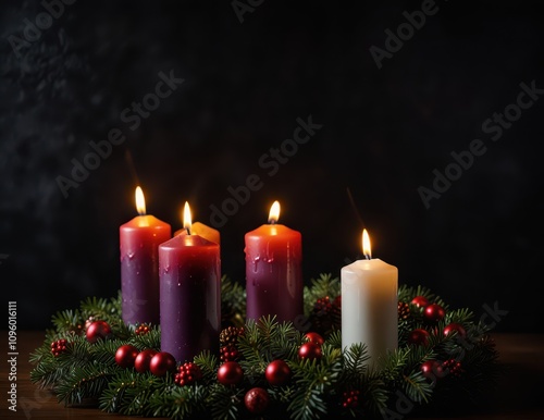 Advent Wreath: Four candles on a traditional Advent wreath, signifying the anticipation of Christmas. The soft glow of the candles creates a warm and inviting atmosphere.