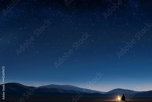 adventure under the stars, a lone traveler gazes at the starry desert sky, with a campfire nearby, endless possibilities await