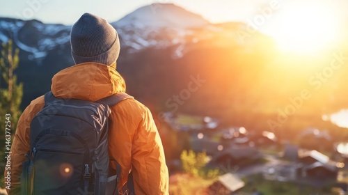 Adventurous Hiker Enjoying Sunset Over Majestic Mountain Landscape