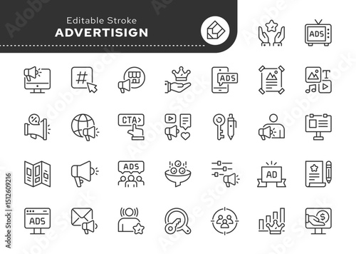 Advertising line icon set. Promotion, speaker, advertiser, ADS, branding, AD, marketing, ad, banner, flyer, billboard, campaign and more. Outline icon in linear style. Vector collection.