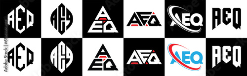AEQ letter logo design in six style. AEQ polygon, circle, triangle, hexagon, flat and simple style with black and white color variation letter logo set in one artboard. AEQ minimalist and classic logo