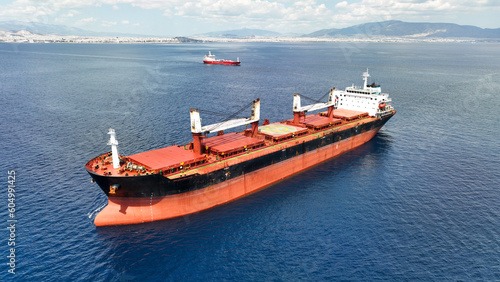Aerial drone photo of huge bulk carrier tanker anchored in deep blue Aegean sea