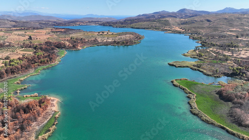 Aerial drone photo of lake and dam of Marathon after mega fires of Athens in August 2024, Attica, Greece