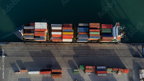 Aerial image of cargo ship in the port. Containers on the ship to export