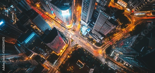 Aerial night view of a busy city intersection with glowing street lights and skyscrapers.