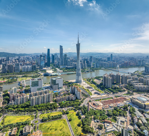Aerial panorama of Guangzhou's modern skyline including skyscrapers and financial district, China.