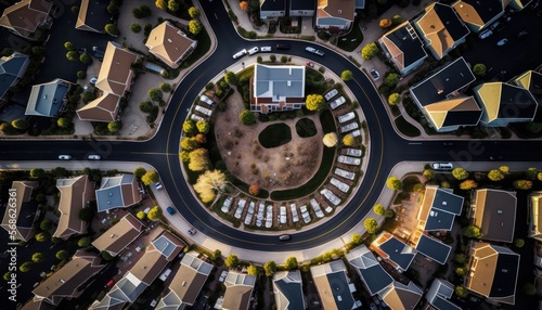 Aerial Panoramic View Of Suburban Neighborhoods And Housing Developments : Stunning Drone Footage Showcasing Overhead Bird's Eye Perspective (Generative AI)