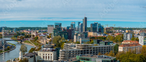 Aerial perspective of Vilnius, Lithuania, featuring modern and historic buildings, the Neris River, and solar panels on rooftops amidst lush greenery.