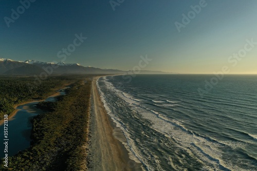 Aerial photograph of coastline as the sun sets on the west coast of New Zealand.