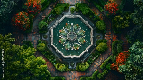 Aerial Photograph of Intricate Botanical Garden Layout Revealing Symmetry and Patterns