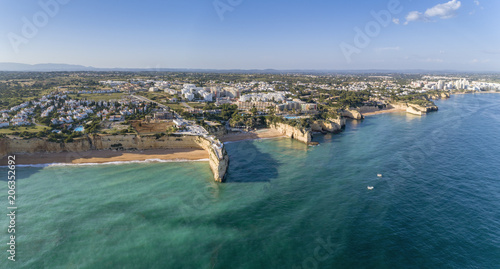 Aerial rocky famous seascape cape and Senhora da Rocha church on top of the cliff, in Algarve.