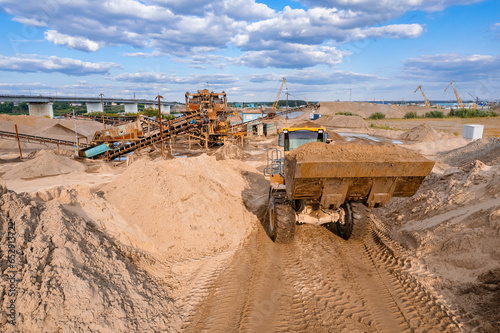 Aerial top view mining excavator loading sand in lorry truck in opencast. Open pit mine concept