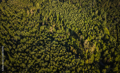 Aerial top view of coniferous green trees in a forest in Swiss Alps